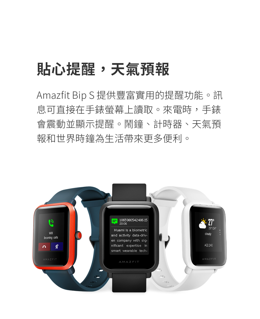 Amazfit Bip S 提供豐富實用的提醒功能。訊息可直接在手錶螢幕上讀取。來電時,手錶會震動並顯示提醒。鬧鐘、計時器、天氣預報和世界時鐘為生活帶來更多便利。