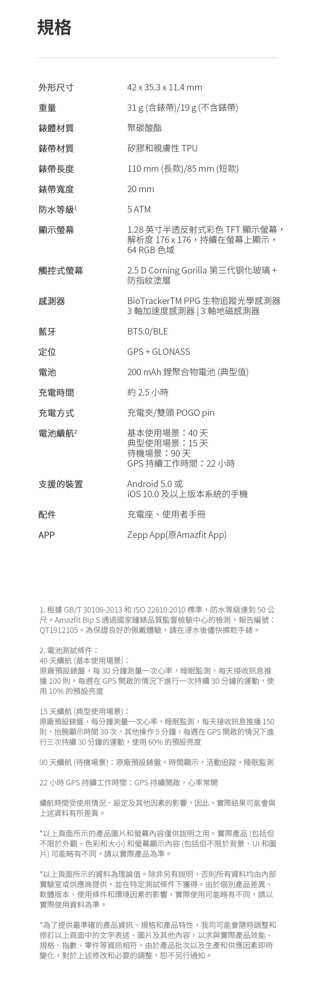 1. 根據 GB/T 30106-2013 和 ISO 22810:2010 標準,防水等級達到 50 公尺。Amazfit Bip S 通過國家鐘錶品質監督檢驗中心的檢測,報告編號:QT1912105。為保證良好的佩戴體驗,請在浸水後儘快擦乾手錶。