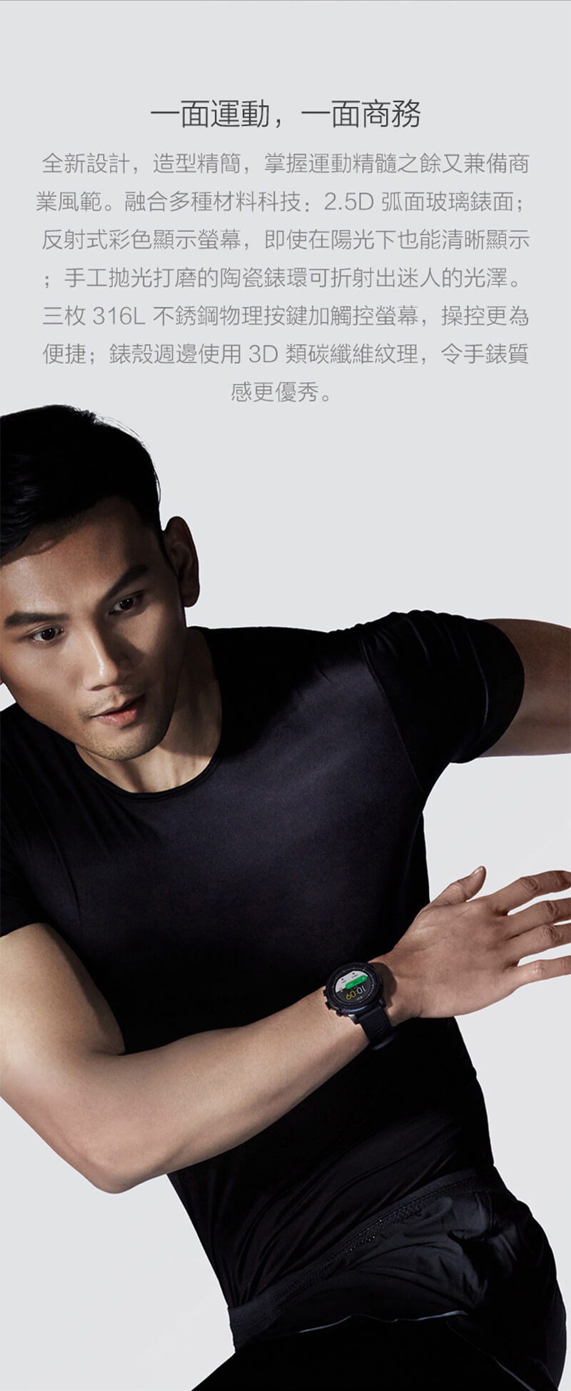 三枚 316L 不銹鋼物理按鍵加觸控熒幕,操控更為便捷;表殼週邊使用 3D 纇碳纖維紋理,使得錶質感更優秀。