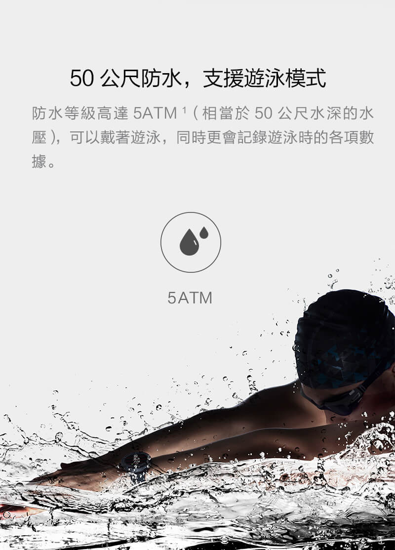 防水等級高達 5ATM 1(相當於 50 公尺水深的水壓),可以戴著遊泳,同時更會記錄遊泳時的各項數據,支援開放水域和泳池兩種模式。