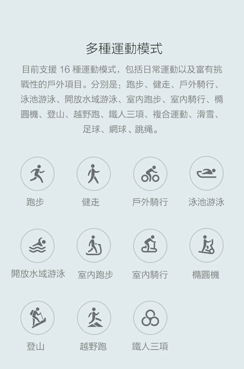 目前支援 16 種運動模式,包括日常運動以及富有挑戰性的戶外項目。