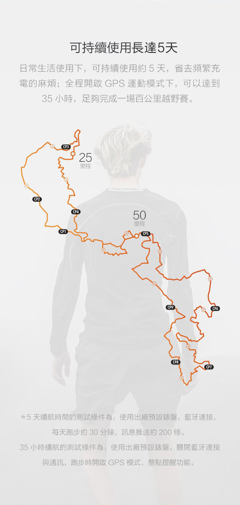 3、35 小時續航的測試條件為:使用出廠預設錶盤,關閉藍牙連接與通訊,跑步中開啓 GPS 模式、整點提醒功能。